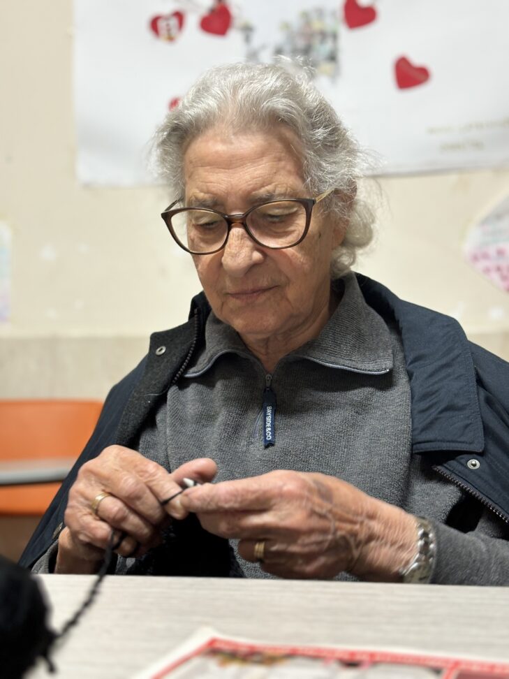 “In realtà – continua don Sergio – alcuni dei 7 progetti attivi, più altri due in cantiere studiati proprio per il 50esimo, nascono dopo il covid. Tra questi “L’Artigiano”, laboratori di creatività, crescita personale e formazione nell’Oratorio San Filippo Neri. Spazio in cui mani, mente e cuore si accordano per dare forma al bello, al buono e al vero. Insomma alla relazione autentica. Laboratori dove tutte le fasce di età possono scoprire e valorizzare i propri talenti attraverso esperienze manuali, artistiche ed espressive, in omaggio a S. Giuseppe, custode laborioso e silenzioso. Attività che spaziano dalle arti visive – disegno, pittura, fotografia, tecnica mista -, alla musica, dal teatro all’artigianato, fino ai laboratori manuali e tecnologici aperti a persone con disabilità o bisogni educativi speciali, in un’ottica di vera inclusione. Non solo fare, ma collaborare, rispettare i tempi dell’altro, scambiarsi idee. Educare alla cura, alla pazienza, alla precisione, alla responsabilità, come atteggiamenti di vita e di fede. Tra i manufatti realizzati: borse, sciarpe, cappelli, scaldacollo. Ma a togliere il fiato è la mano ferma dell’uncinetto di Francesca Capogna, vedova D’Avanzo, per tutti Franceschina. Il suo pudore e la sua reticenza sono cosi forti che teme di dirci la sua età, quasi che il suo essere in vita, autonoma e in salute sia una colpa: è prossima ai 91 anni. Ma ha la passione di una ragazzina, il desiderio di trasmettere un’arte antica tramandata da sua nonna e poi dalla mamma. “Avevamo cominciato con rammendare le calze da bambine – aveva 4 sorelle spiega – poi a lavorare la lana ai ferri e infine anche all’uncinetto. Sono stata interpellata da don Sergio e ho trovato persone disponibili a imparare. Dai miei tre figli, due fuori sede, ho ricevuto pieno consenso a spostarmi in parrocchia. Poi mangiando viene l’appetito e così si perfeziona la tecnica. Abbiamo confezionato bei capi per i mercatini di Natale, anche oggetti utili come i porta telefoni. Ci siamo divertiti e sono molto soddisfatta per la buona riuscita: un piatto realizzato con le proprie mani ha il sapore della genuinità, ma anche dei partecipanti che speriamo d’incrementare nelle adesioni. Serve volontà – ammonisce ancora Franceschina – tanta pazienza, esperienza e una buona vista naturalmente”.
