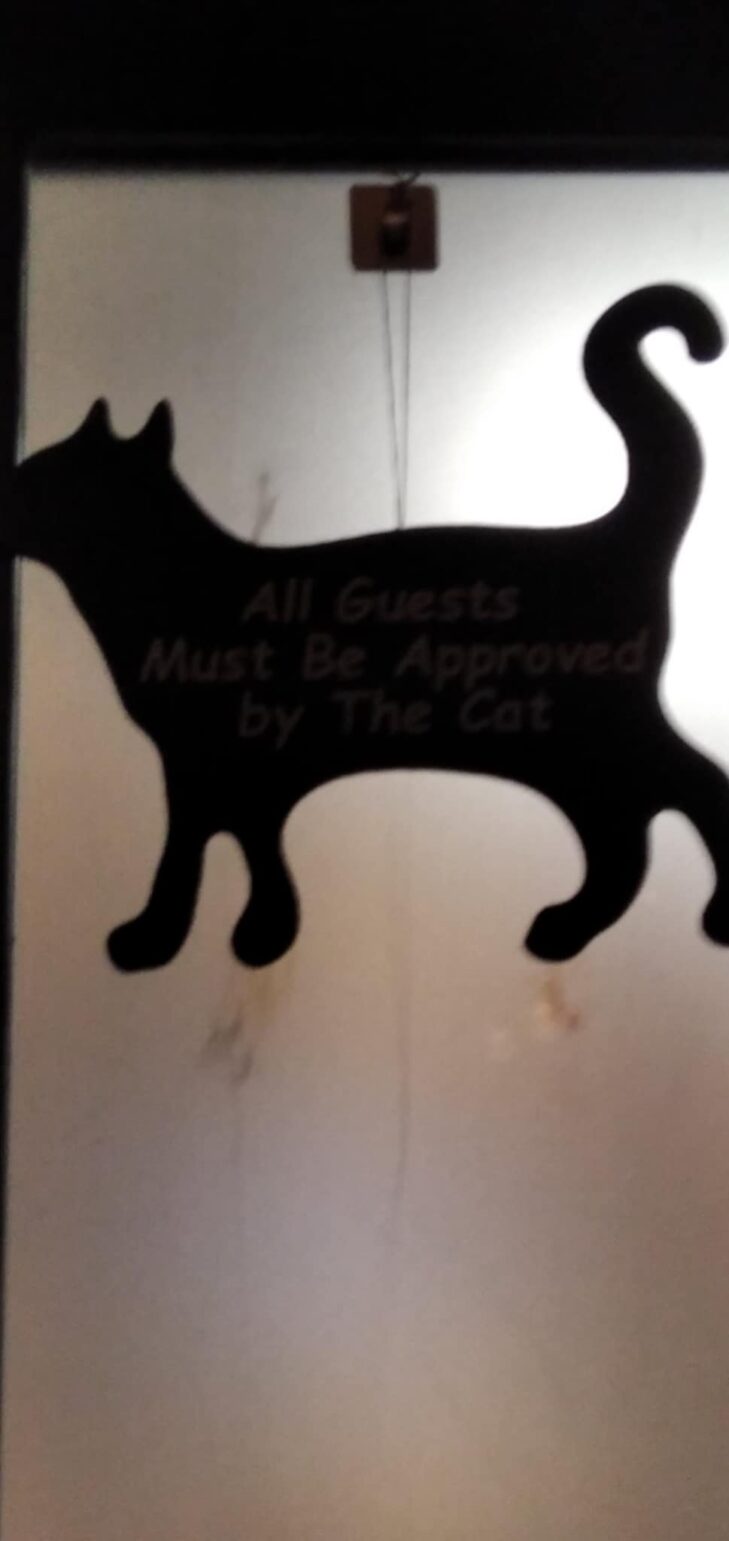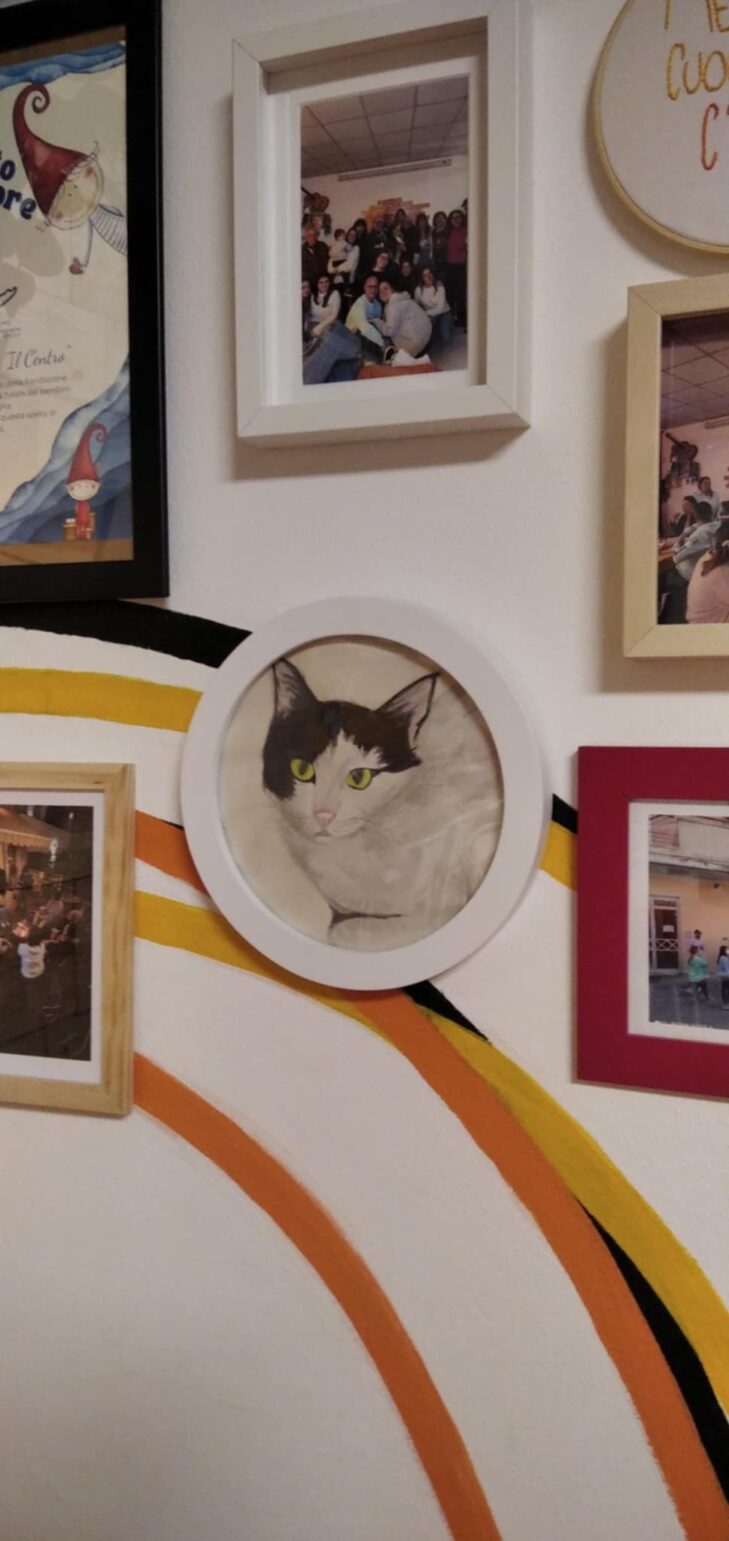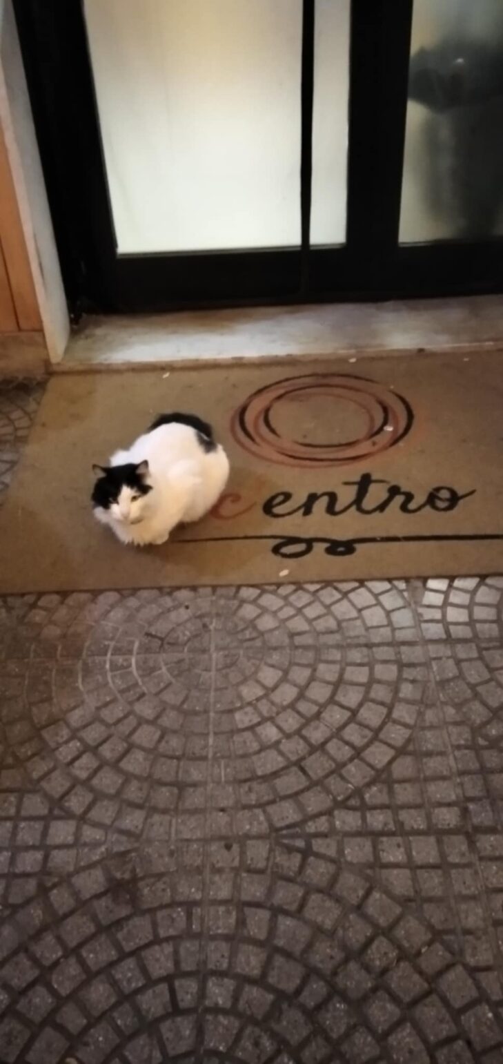 Ad accoglierci sul tappeto è un gatto bianco e nero, che i ragazzi hanno battezzato Coda Liscia. Non possiamo entrare se lui non ci dà il permesso, perché è il vero padrone di questo luogo di aggregazione, situato a due passi dal Santuario di Pompei.