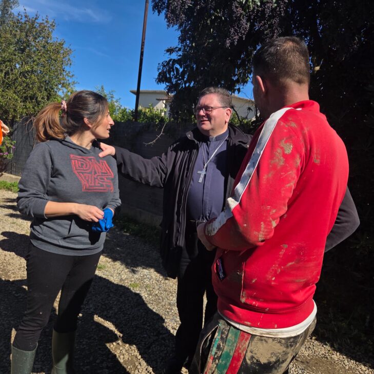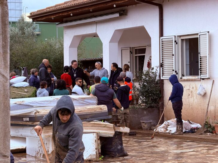 “L’acqua è entrata nelle abitazioni – riferisce don Claudio – lasciando segni indelebili su pareti, arredo, materassi. Tutto impastato di fango, da buttare. Cinquecento persone sono state evacuate e vivono in bed and breakfast, soprattutto i più vulnerabili e stranieri che non hanno parenti. Chi ha avuto la fortuna di trovarsi in aziende con abitazioni al primo piano è riuscito a rifugiarvisi. Ma al 98% le case sono tutte a piano terra, con le masserie o le aziende agricole: coltivazioni di ortofrutta, allevamenti di galline, pecore, vendita di formaggi. Con i parroci delle frazioni di S. Nicola a Thurio e dei Ss. Pietro e Paolo a Tarsia, rispettivamente don Vittorio Salvati e don Cosimo Galizia, abbiamo organizzato i soccorsi non appena si è placata la furia dell’alluvione, facendo una prima stima dei danni creati dall’esondazione del Crati. Le strade sono voragini e questo fa molta paura anche per gli spostamenti. L’esserci, come Caritas diocesana è fondamentale: abbracciare di persona, ascoltare la rabbia delle popolazioni colpite, sostenere la loro disperazione. Il nostro arcivescovo si è recato personalmente nei luoghi colpiti, per benedire uno per uno gli abitanti. Spalare il fango non è assolutamente facile – continua don Claudio – e abbiamo immediatamente iniziato la raccolta degli attrezzi indispensabili: palette, carriole, scope, detersivi, stracci. È partita anche una distribuzione capillare e tempestiva nelle parrocchie e nelle famiglie, grazie ai nostri volontari, dei pasti offerti pure dalle Caritas di S. Marco Argentano – Scalea e da Cosenza. Alcuni luoghi li abbiamo raggiunti addirittura con i canotti. La gente cerca di resistere, ma danni ingenti sono causati anche dall’umidità che si è infiltrata e richiede interventi straordinari di manutenzione. Mi ha particolarmente colpito un signore, che è riuscito a salvare la cucina nuova, che stava pagando ancora, smontandola pezzo per pezzo!”.